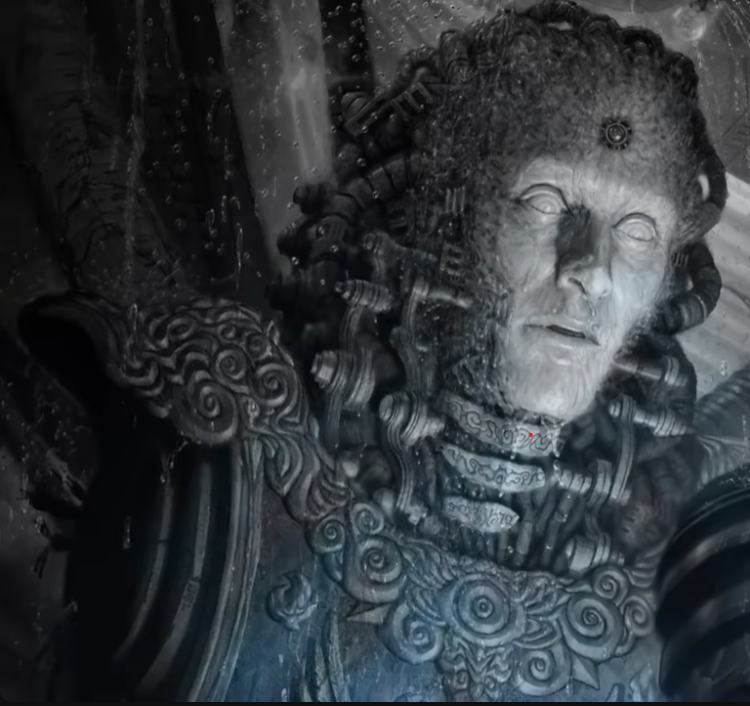 More machine than man, Jari resembles a broken statue. Limbs largely replaced with wires and metal, hoses for nutrient delivery and waste removal feed into his body below a dark human face with a bright red laser positioned in the center of his forehead. Blood long since replaced with a white fluid, what flesh remains is ashen in color. He speaks through his mouth with a hunan voice.